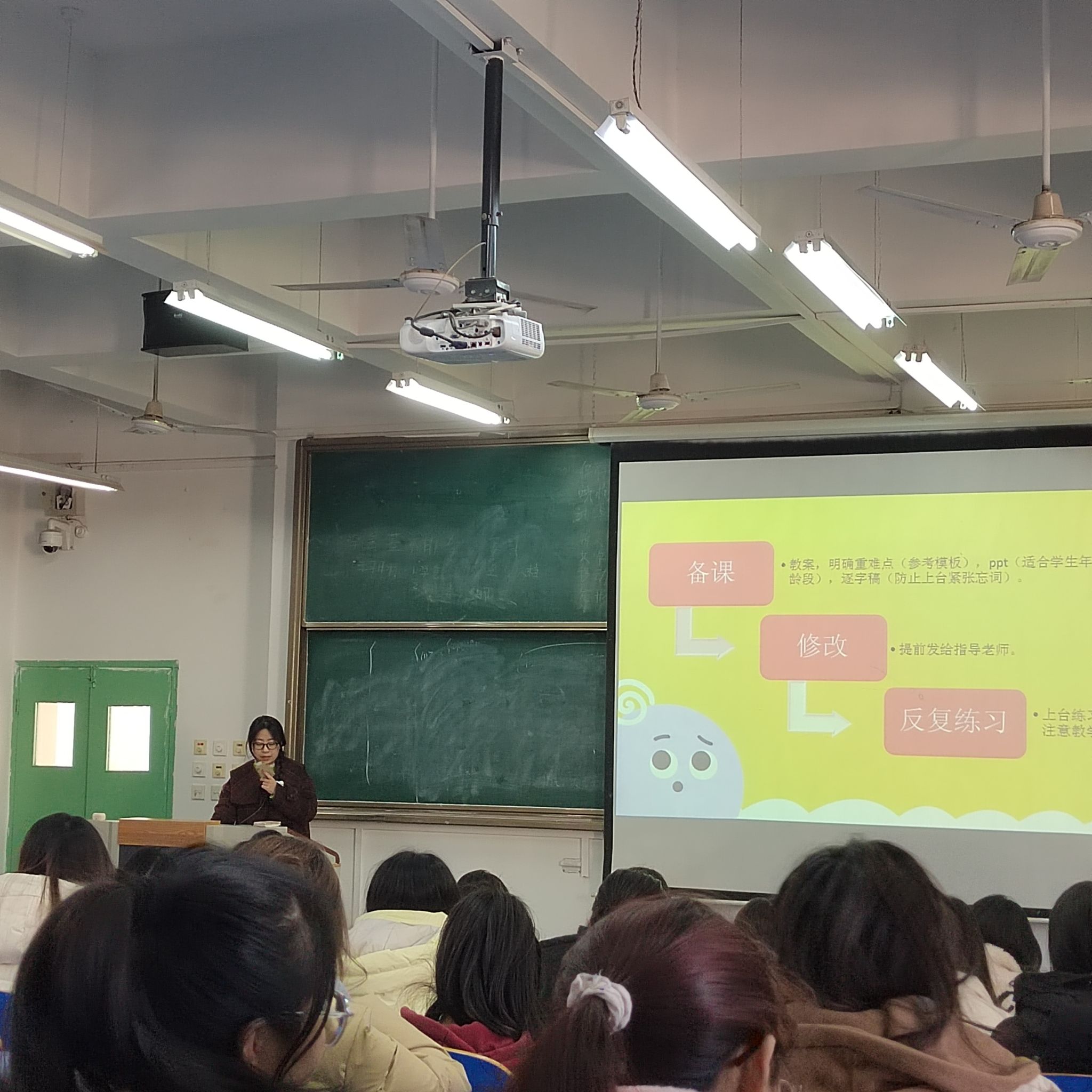 首先陈小萍老师向各位参会同学介绍召开本次会议的目的,并介绍了到会人员,心理2101班4位同学做了经验分享:冯子怡同学从备好教材、备好员工、备好教法和备好作业展等方面介绍了相关的经验;李飞同学从如何备课讲课方面进行了经验介绍,并鼓励学弟学妹多锻炼自己的讲课能力以更好的面向员工、适应讲台;卫雨欣同学介绍了选取教学主题、课堂导入、PPT制作的经验;焦鑫告诉同学们一堂好课不仅要备好课、上好课,还要有及时的课后复盘和反思,提升自己的教学能力,完善自己。经过四位同学的经验介绍,参会的各位同学表示收获很大,准备积极应对下学期的见习活动了。